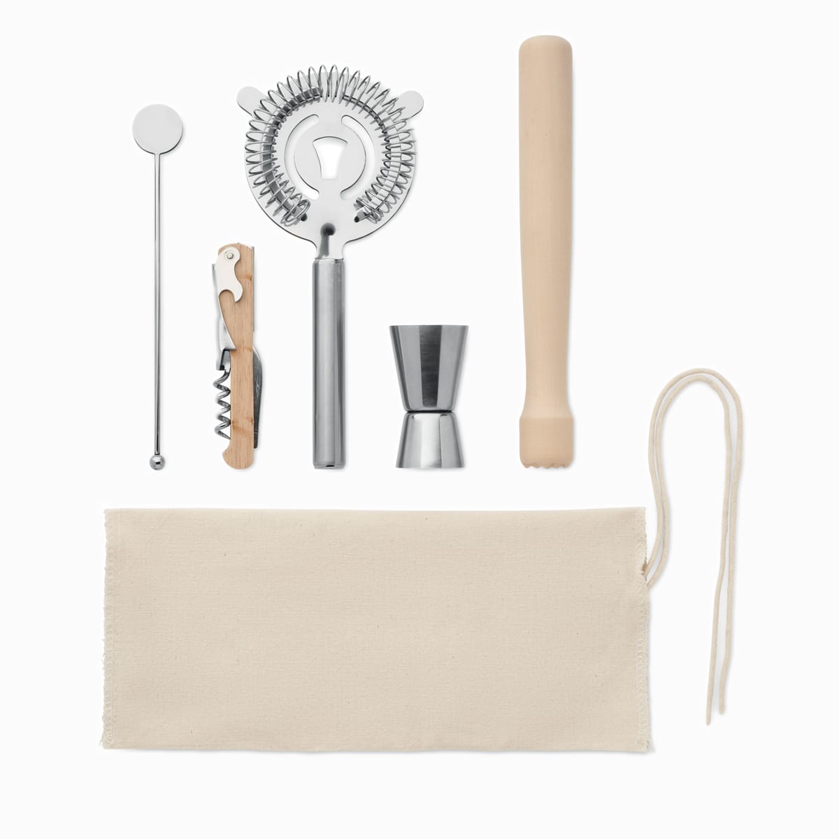 Cocktail kit in cotton pouch with string. Including 5 piece: a double-sided measuring jigger (15 & 30 ml), wooden muddler, cocktail strainer, drink stirrer and waiter’s corkscrew knife.